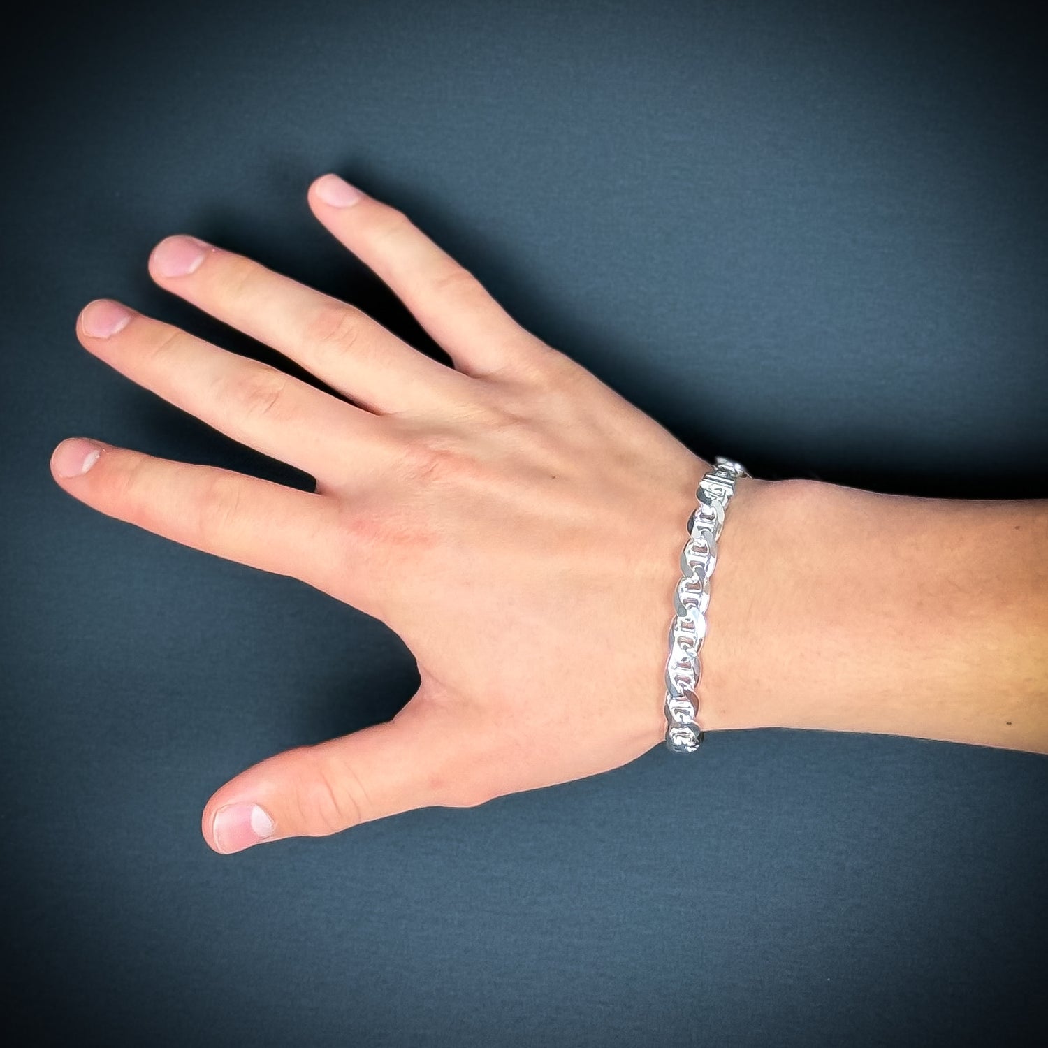 The silver Mariner link features interlocking oval links resembling nautical anchor chains, believed to have originated from seafaring cultures for its durability and maritime symbolism.