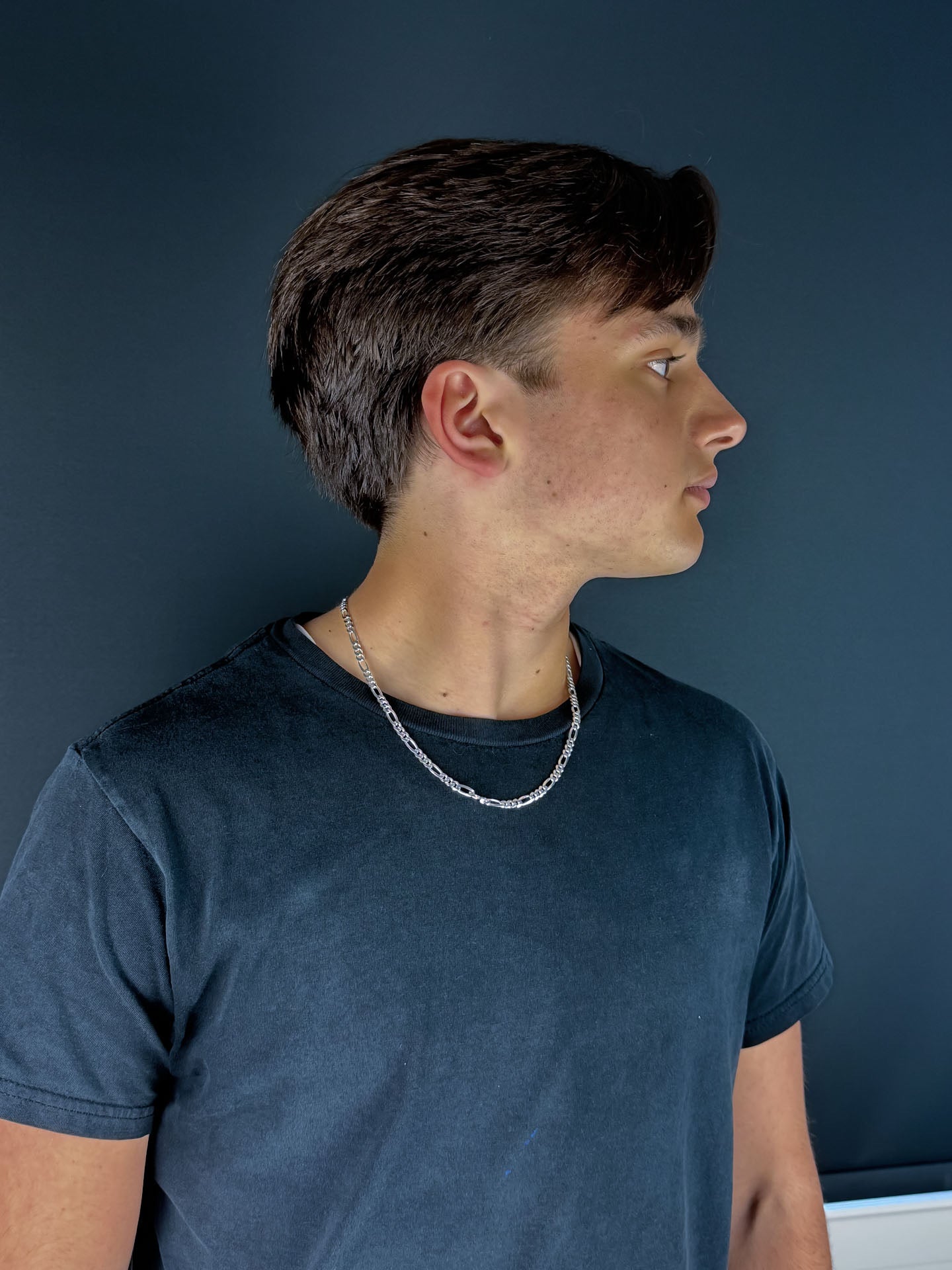 The silver Figaro link is a classic jewelry piece characterized by its alternating pattern of small circular links followed by larger elongated links, originating from Italy in the 18th century.